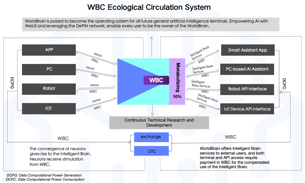 WBC is the ecological token of WorldBrain, with a total supply of 10 billion (no further issuance). It serves as the cornerstone for the organic interaction and the entire ecosystem. WorldBrain intelligent contributors obtain WBC tokens through interactions and completing annotation tasks, while WorldBrain intelligent users pay WBCs to access the superintelligence services provided by WorldBrain. This completes the entire token circulation. In the circulation process, a metabolic mechanism is introduced on the WBC consumption side. In all transactions where WBCs are used to purchase WorldBrain superintelligence services, 10% of the received WBCs is directly burned. This is known as metabolism.